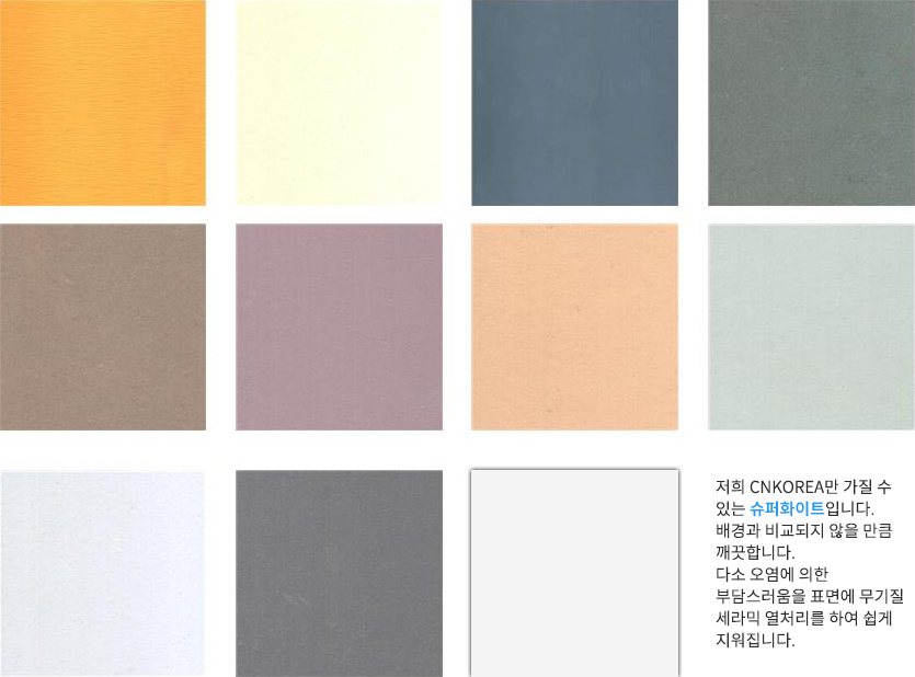 • 표면은 무기질처리 Ceramic Treated국내최초)를 하여 색감이 뛰어나며 표면강도 및 방오기능을 강화하여 낙서 및 오염방지에 강합니다.