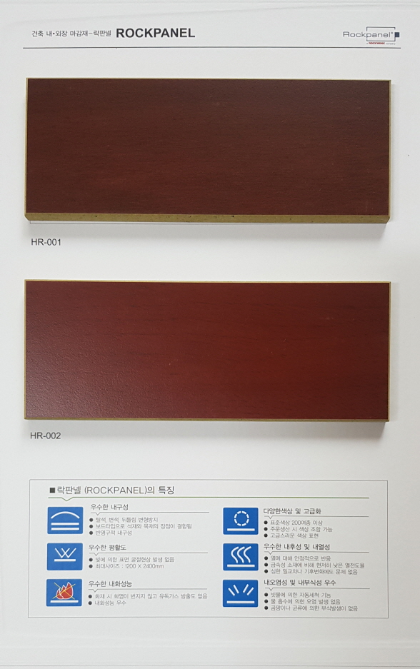 불연 고밀도 목재패널인 락판넬(ROCKPANEL)은 유럽지역에 널리 알려진 패널이며, 작업이 용이하면서 화재시에도 안전한 건축자재 입니다.